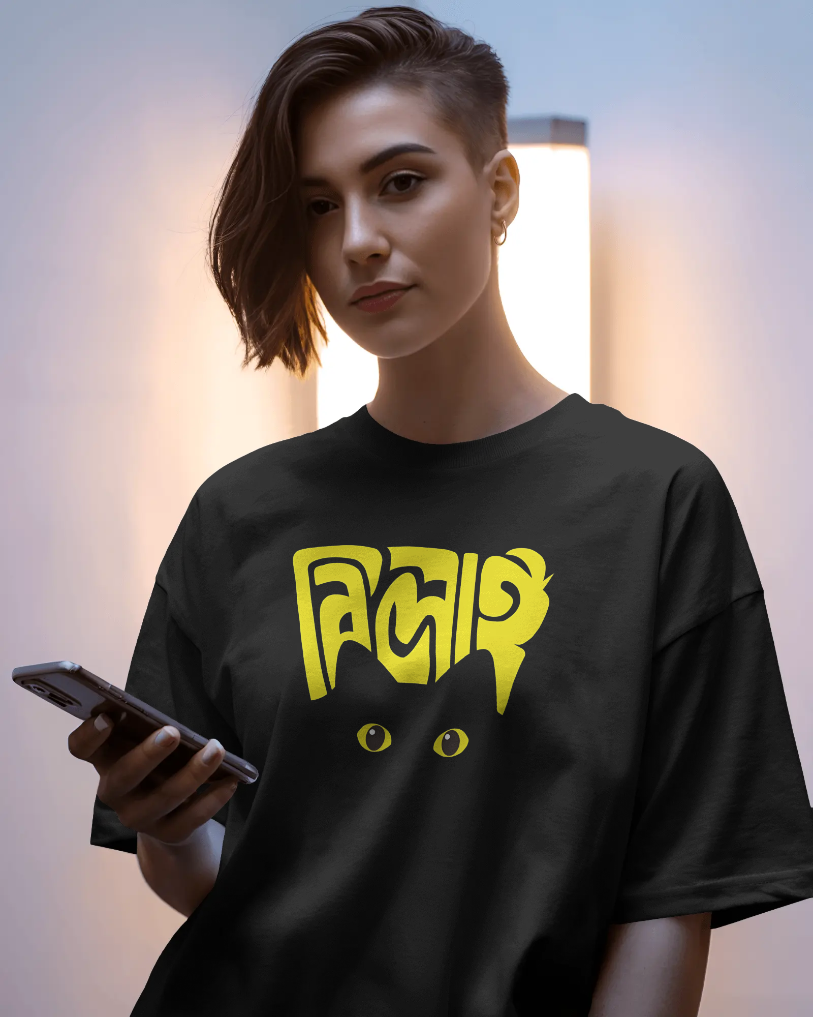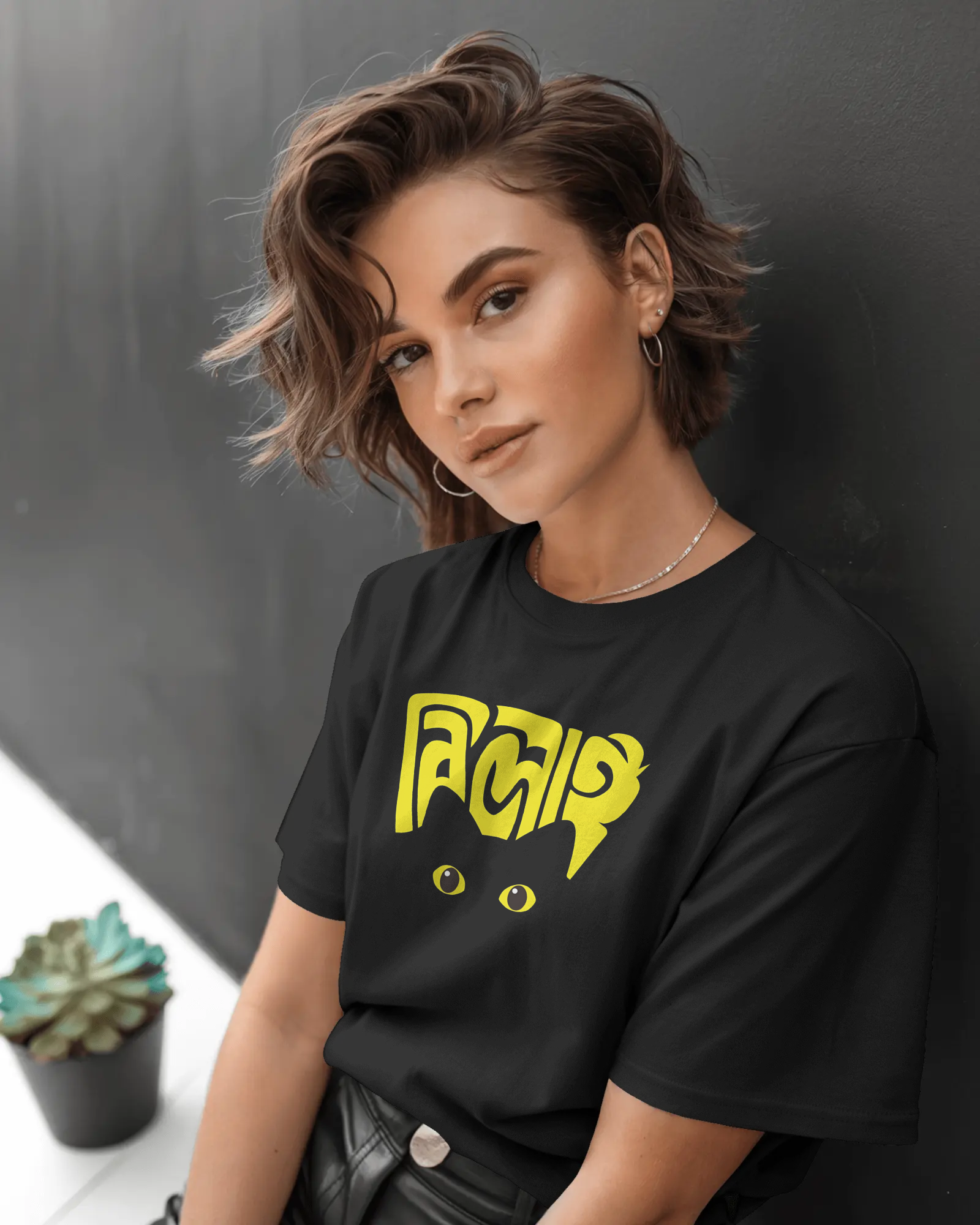 Unleash your inner feline charm with our exclusive Bengali Cat Design Black T-Shirt! This unique graphic tee features a playful peeking cat motif, subtly integrated with elegant Bengali script (which appears to be ‘Biral’ or similar, meaning ‘Cat’).