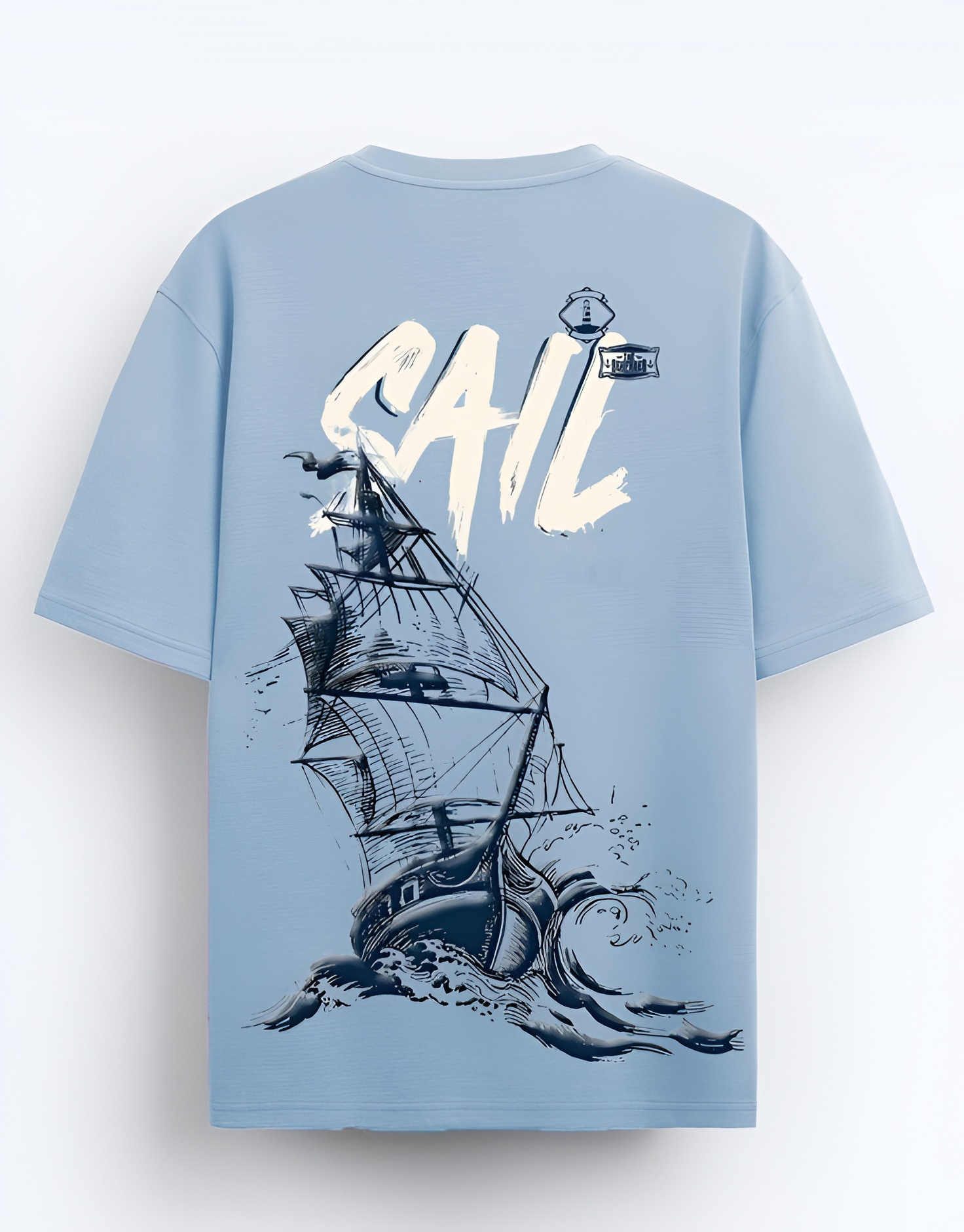 Set sail in style with this blue oversized T-shirt featuring a bold sailing ship graphic on the back. Perfect for those who love nautical vibes, casual streetwear, or beach adventures. Comfortable cotton blend fabric, available in sizes S–XXL.