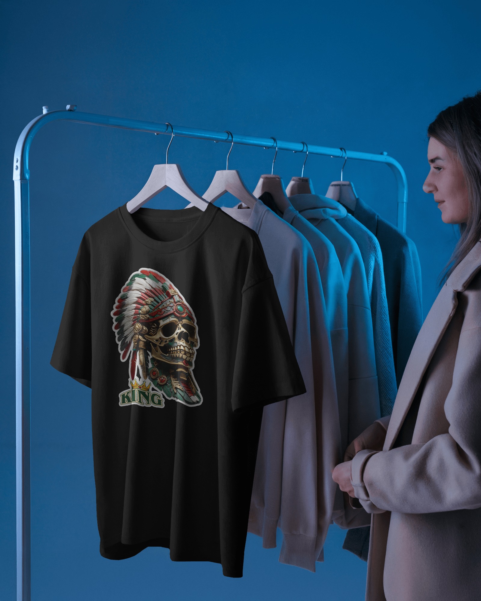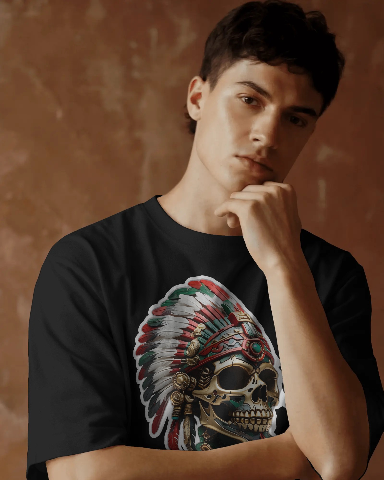 The Aztec Warrior Skull Oversized T-Shirt captures the fearless essence of ancient warriors through modern streetwear art.